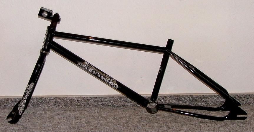 This is a early 2nd gen. Hutch Pro Racer from 1982 made by Profile. It was originally chromed and painted black afterwards. I actually bought the set just to get the forks and rechrome them but then decided to keep and buid this Hutch since it looks so sweet in black.